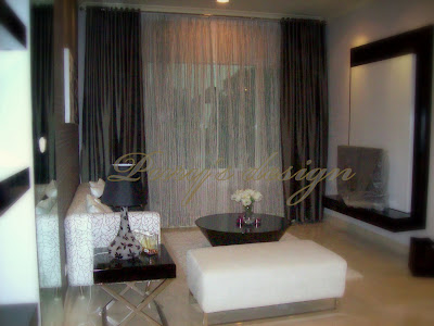 Tema modern dengan nuansa hitam putih dipilih untuk interior living room apartemen ini. Konsepnya adalah ingin membuat interior yang tidak terlalu "centil" tetapi masih terlihat "cantik", sehingga bisa dinikmati oleh costumer pria dan wanita. Penggunaan warna-warna monochrome dengan penggunaan material stainless dan finishing duco glossy pada furniture-nya memberikan kesan sedikit "maskulin" pada interior apartemen ini. Tetapi untuk memperlembut ruangan, motif seperti bunga dan daun diaplikasikan pada fabrics dan accecories interior.